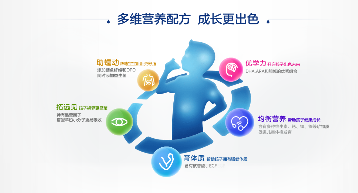 多维营养配方,成长更出色 特有晶莹因子,为视力发育多一点“睛滢” 羊奶好吸收易消化 羊乳蛋白