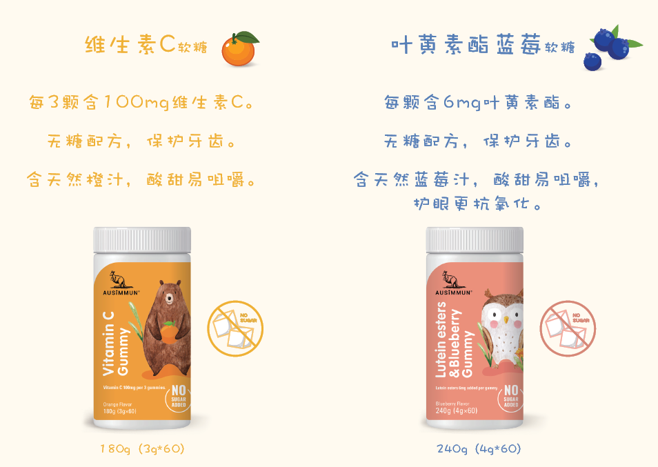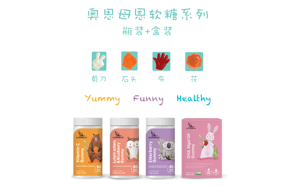2020年年中,奥思母恩AUSIMMUN营养食品品牌再添新成员,奥思母恩AUSIMMUN接骨木莓无糖配方软糖、维生素C无糖配方软糖、叶黄素酯蓝莓无糖配方软糖、DHA藻油无糖配方软糖正式全新上市,伴随生活水平的提升,新生代父母更愿意为孩子的健康买单。母婴营养市场逐渐成为企业品牌重点开辟的市场。相信接骨木莓软糖、维生素C软糖、叶黄素酯蓝莓软糖、DHA藻油软糖4款产品的亮相,必将为奥思母恩AUSIMMUN创造更高的品牌价值。
