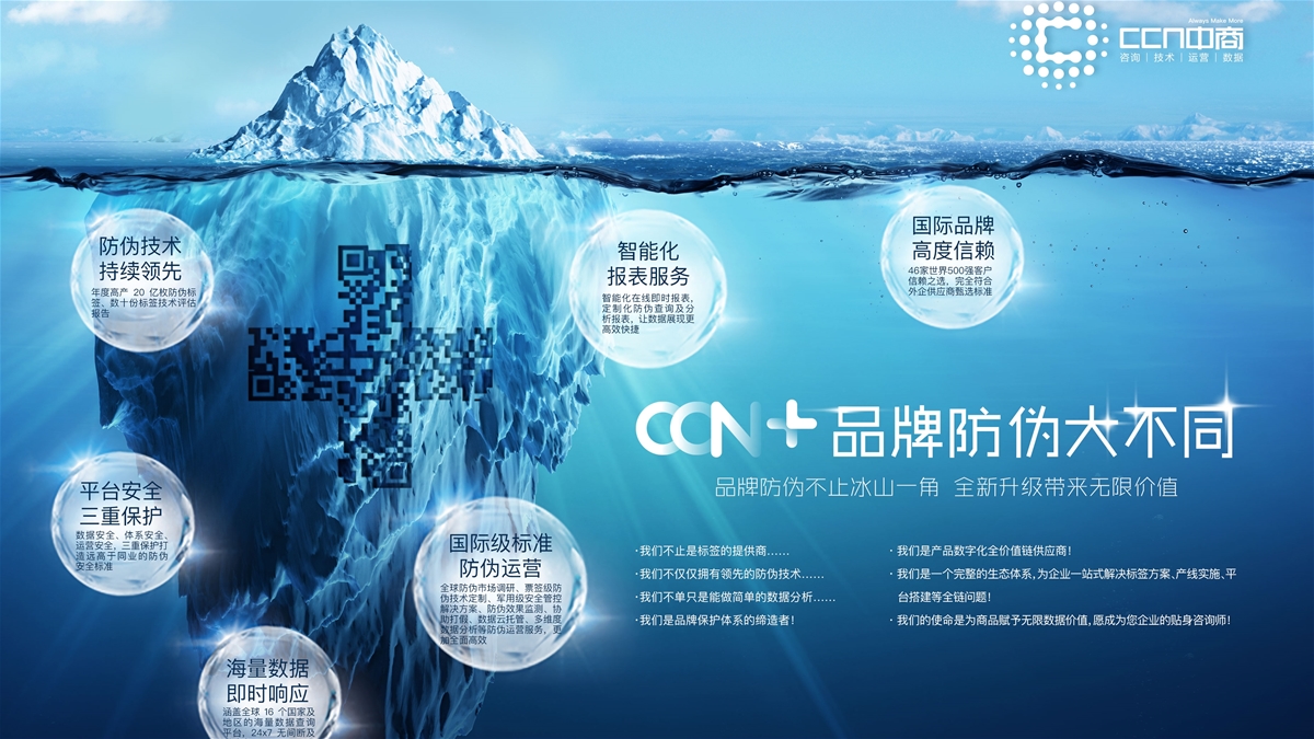 在一物一码+数字化营销专业领域,CCN中商是中国追溯、数字营销领域的领衔者上海中商网络股份有限公司(以下简称CCN中商)于2000年初成立,作为北京华联集团的控股子公司,以“为商品赋予无限数据价值”为企业使命,二十年来始终致力于通过技术、数据、运营、咨询四大版块,为客户提供品牌保护、渠道管控、营销全价值链产品及服务。