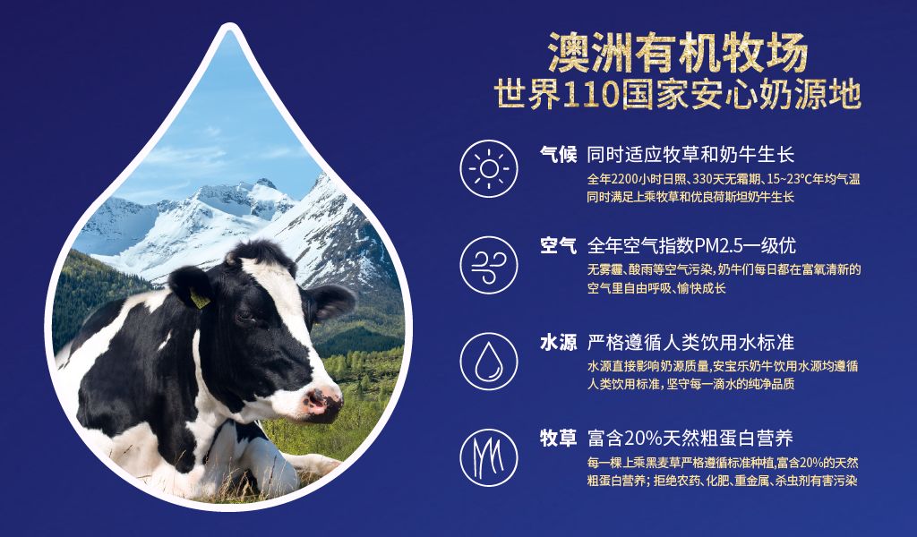安宝乐坚持用自有的严苛品质监控体系打造奶源新标准,从奶牛源头把握每一罐好奶粉的优胜营养。