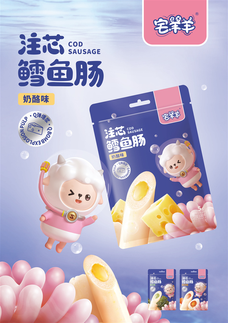 宅羊羊高端注心鳕鱼肠,在原料上,选用采用拉斯维加斯深海鳕鱼,安全营养,鳕鱼含量高达70%;在工艺上,采用韩国进口技术,标准化设备,保证产品质量稳定如一。注心美味,多重营养又健康,三种口味:奶酪味、海苔味、蛋黄鱼籽味,肉质新嫩Q弹,爽口不腥,一口爆浆好滋味。