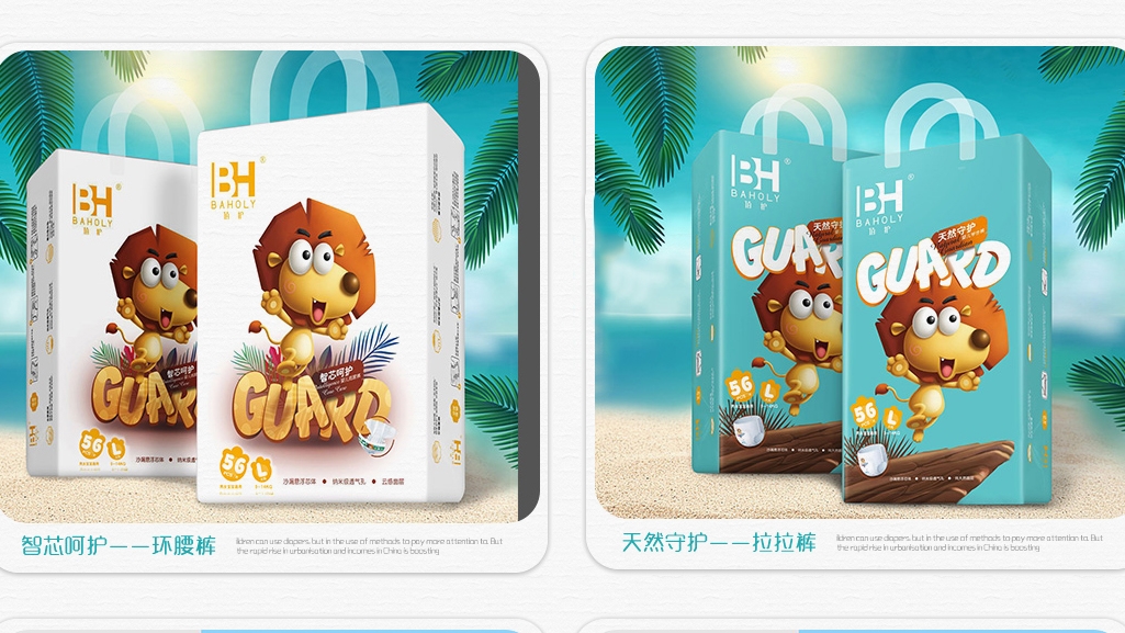 旗下“佰护”系列纸尿,采用悬浮芯体,干爽柔肤表层,无刺激皮肤成分,更天然,更环保热风底模,全新沙漏工艺,前后防漏,拉断式大环腰设计,高腰弹力无死角,更贴合,更舒适;魔术扣选用进口材料,柔软不伤肤,牢牢扣住不脱落,让宝宝活动自如,更牢固,更安全;天然呵护型体现了佰护品牌产品的高端质量、呵护传达佰护全心关爱、陪伴宝宝、守护宝宝健康成长的理念主张。