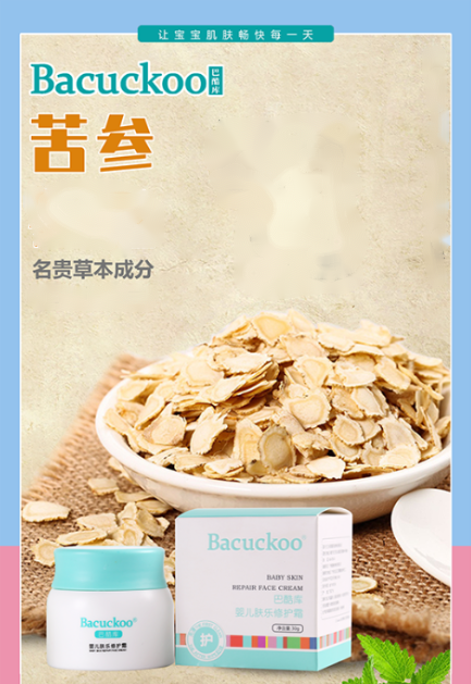 巴酷库婴儿肤乐修护霜,采用植物低温萃取技术,以草本植物“苦参”为核心成分,另外配比洋甘菊、积雪草、芦荟、金银花、荆芥 、连翘、金盏花、光果甘草、乳木果油多种植物提取,呵护宝宝娇嫩肌肤,给宝宝全新体验。