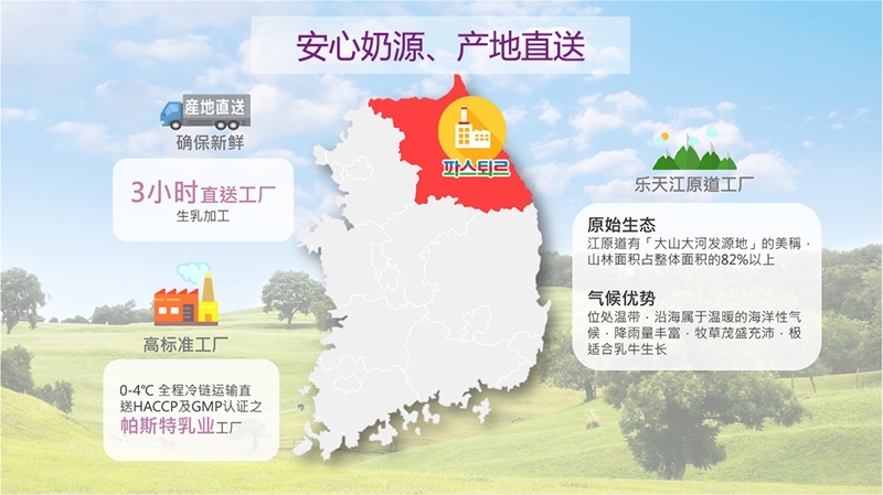 启葆奶粉产自帕斯特乳业,帕斯特乳业于1987年成立于韩国江原道,为乳业一体化生产基地。江原道优质乳源得益于得天独厚的环境优势,具有“大山大河发源地美称”的江原道,山林面积占整体面积82%以上,位处温带,沿海属于温暖的海洋性气候,降雨量丰富,牧草茂盛充沛,极适合乳牛生长,因而乳牛产奶量丰富、营养。数因使然,江原道牛乳已经达到1A级优质奶源标准,原乳标准远高于美国、欧盟等国家。为了保持奶源的纯正,启葆还采用新鲜生乳0-4°C 全程冷链运输, 3 小时直送帕斯特工厂加工,确保鲜活。为高品质牛奶的输出,做好了充分的准备。
