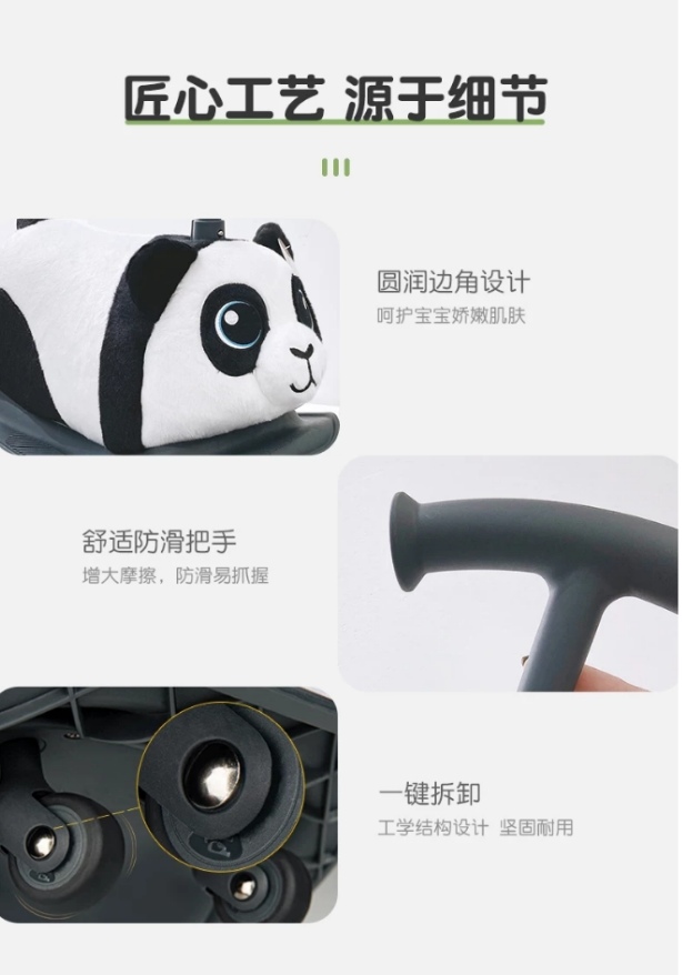 YVolution菲乐骑团队致力于为孩子们带来有趣童年的同时,也没有忽略产品结构的便携和防护以及宝爸宝妈的体验感!于是为宝宝和宝爸宝妈们带来了一拆二的熊猫摇摇车~