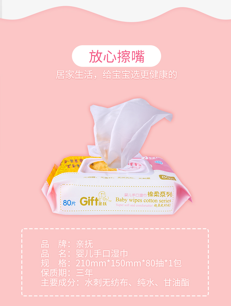 亲抚婴儿手口湿巾未经荧光增白,温和洁肤,刺激性弱;选用蜂胶精华,蕴含生物活性酶,锁水性持久,久置不干;采用优质水刺无纺布、纯净山泉水、甘油酯,纯棉般柔软,呵护婴儿娇嫩肌肤;通用性湿巾,全家适用;不连抽设计,一抽一张,避免浪费。