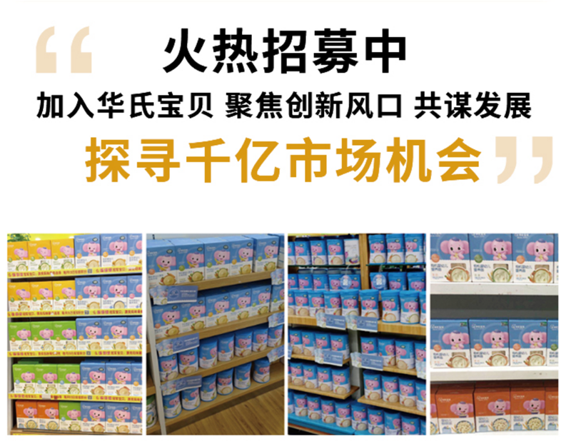 “做好辅食,让宝宝吃好”是华氏宝贝的初心,也是华氏宝贝坚守产品升级的更好佐证。华氏宝贝遵循宝宝生长发育,严守产品创新,通过米乳、米粉、面条等辅食不断升级,辅食由细到粗、由单一到多样、由稀到稠……再到工艺的严格把控,为品牌带来持续生命力,同时积极与全国优秀供应商深入交流,在产品质量上严格把控,满足她们对高品质的消费需求。