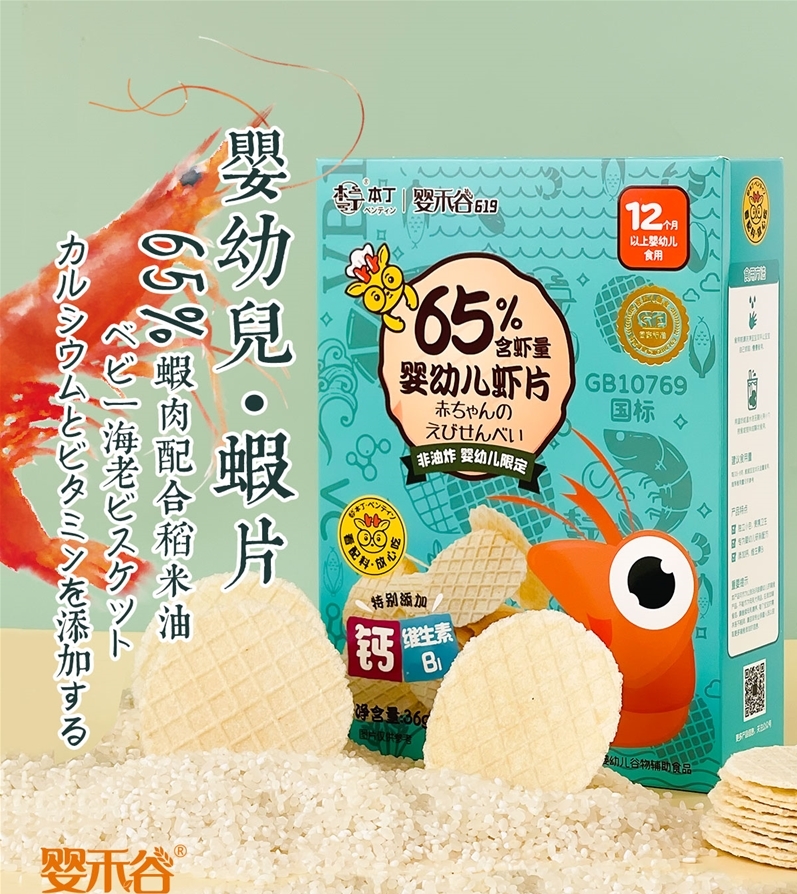 本丁婴禾谷系列之幼儿虾片,含虾量达65%,特别添加钙,维生素B1等微量元素,配料简单又有营养。非油炸,虾肉搭配上稻米油,包装设计的图案丰富有趣,专为幼儿研发。产品采用独立包装的方式,一下子不能全部吃完也不会容易浪费,虾片又薄又脆,味道鲜美,适合给孩子解馋。