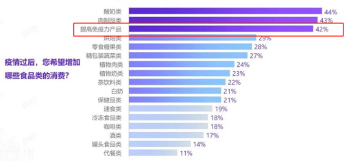 FBIF联合数字100发布的《疫情下快消品消费行为及态度变化》调查显示,疫情之下,42%的消费者希望增加提高免疫力食品的消费,消费者迫切希望能够加强自身健康尤其是免疫健康。
