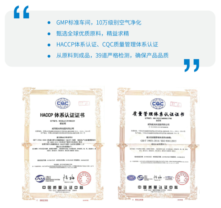 诚长优+品牌隶属威海紫光科技园有限公司,威海紫光成立于1997年,总部座落于山东威海,是一家集生物制品、保健食品、功能性食品及普通食品研发、生产、销售为一体的高新技术企业。公司25年以来专注、专业致力于健康产业,现有国家市场监督管理总局批准的保健食品及SC产品百余款,已被认定为山东省工程技术研究中心和高新技术企业。
