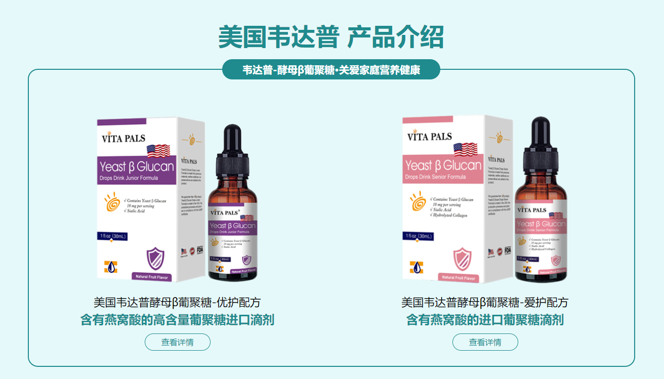 韦达普-酵母β葡聚糖系列分为优护配方和爱护配方,美国原装进口,通过国际多项安全认证,在产品品质和营养配方方面有着巨大的优势。
