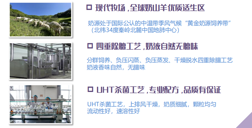 羊奶中富含脂肪、蛋白质、维生素、矿物质、胆固醇等生命基本元素,其脂肪颗粒细,体积仅仅是牛奶脂肪的1/3,更利于人体吸收。怡瑞康羊奶粉系列甄选全球奶山羊优质适生区奶源处于国际公认的中温带季风气候“黄金奶源饲养带”(北纬34度秦岭北麓中国地肺中心)的纯净羊奶,采用分群饲养、负压闪蒸、负压蒸发、干燥脱水四重除膻工艺和UHT杀菌工艺,上排风干燥,奶液香味自然,无膻味,且流动性好,速溶性好。