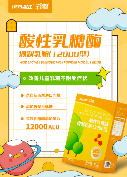 乐萌树酸性乳糖酶调制乳粉(12000型),选自新西兰进口乳粉,添加低聚半乳糖,每袋乳糖酶添加量为12000ALU,专门针对儿童乳糖不耐受。