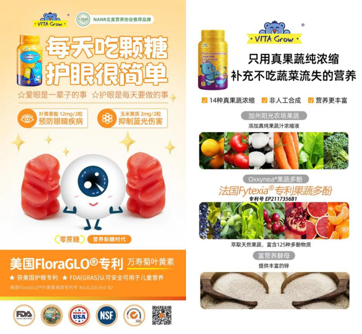 随着行业竞争进入下半场,品质已然成为零食品牌比拼的重中之重,VITA Grow用心擘画产品品质。其中,叶黄素酯软糖拥有美国FloraGLO®护眼专利(专利号:NO.9226940B2),并FDA(GRAS)认可。多种维生素果蔬汁软糖,则获得法国Fytexia®专利果蔬多酚(专利号EP2117356B1)。