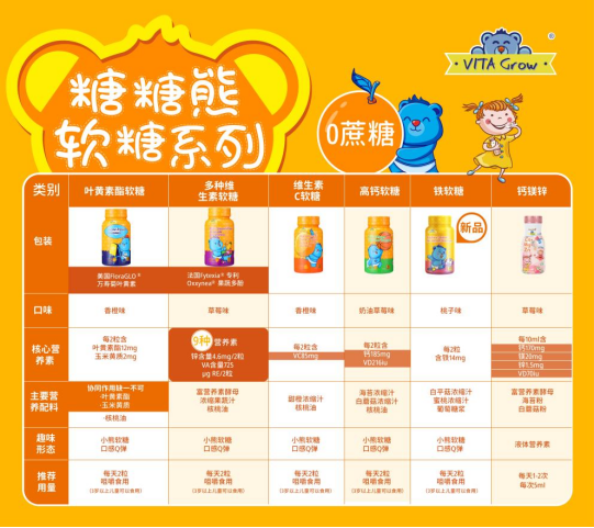 √多种维生素果蔬汁软糖:法国Fytexi®专利Oxxynea®果蔬多酚,添加真纯蔬汁浓缩液,萃取天然果蔬,富含125种多酚物质。每2粒富含锌4.6mg、VC60mg、VD400IU、VE11.2mg,还有丰富B族和VA;