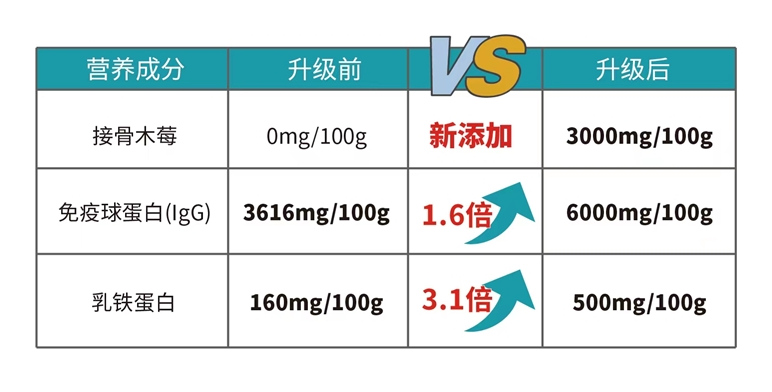 原来的“小蓝罐”乳铁蛋白含量每100g含160mg、免疫球蛋白每100g含3616mg。