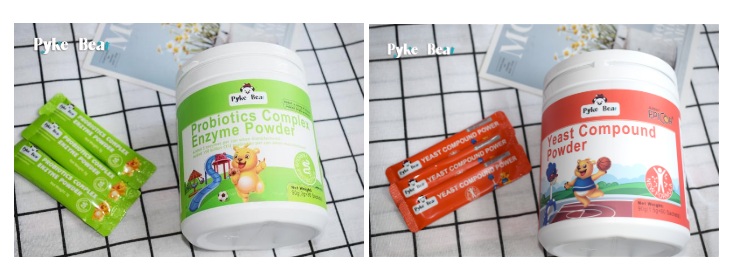 另外,派克熊酵母复合粉、派克熊益生菌复合酶粉两款新品都被制成了小包装的粉剂,每一份都是独立包装,干净卫生,容易保存和携带方便,每盒60袋,可以直接用温水冲饮,也可加入其他流质食物(如牛奶和米粉)中混合拌匀食用;而且使用食品级材料作为壁材将营养成分牢牢的保护起来,既能使有效成分可以很好的发挥出作用,又是使其与外界隔绝,口感更好,宝宝更喜爱。