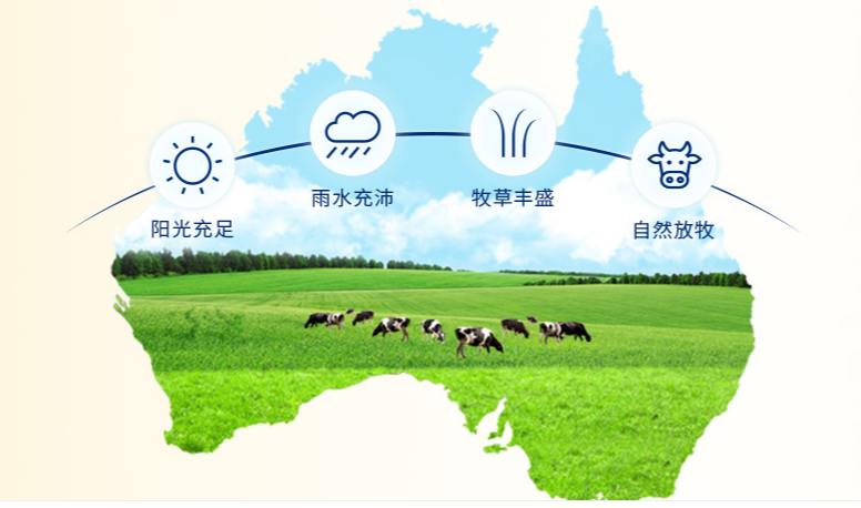 ①优质牧场:南纬37°吉普斯兰奶源,气候温和,雨水充沛,牧草丰盛,营养天然,7亩地一头牛自然放牧;