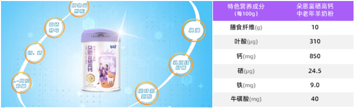 基于这一洞察,朵恩发挥自身多年专注羊奶粉的优势,通过产品创新,率先推出了朵恩富硒高钙中老年羊奶粉,在营养配方和品牌形象方面,均走在了羊奶粉行业前列。