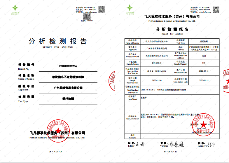 欧比信小不点舒缓滚珠棒不仅有颜有料,实力也很“抗打”。第三方专业机构检测结果表明,产品具有舒缓功效,且蚊虫驱避率达85%,评级为A级,真可谓攻防兼备。