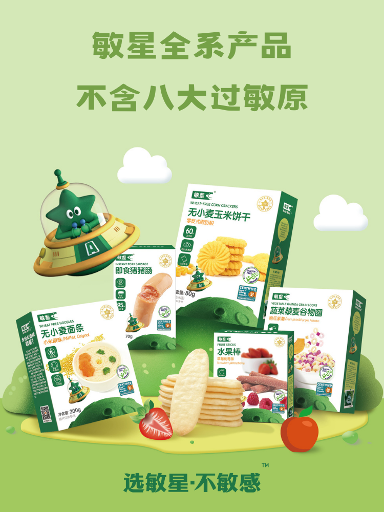 敏星(为中国敏宝专研):2022年特别为敏宝专研“敏星”,规避八大过敏原,甄选更适口食材。代表产品:有机米饼,小熊山楂棒,水果棒,无小麦面条